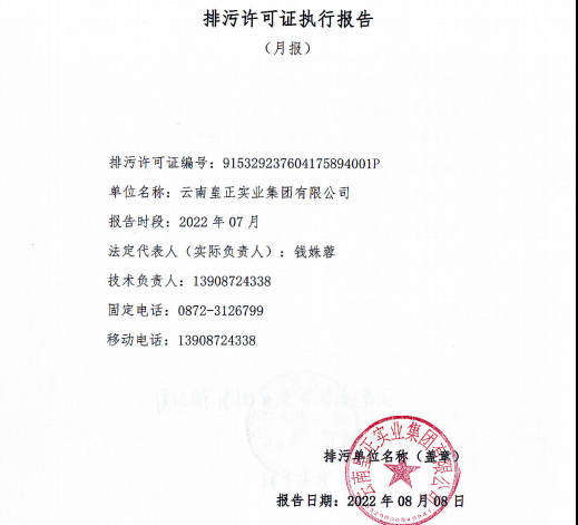 云南皇正實業(yè)集團有限公司 2022年10月排污許可執(zhí)行報告月報